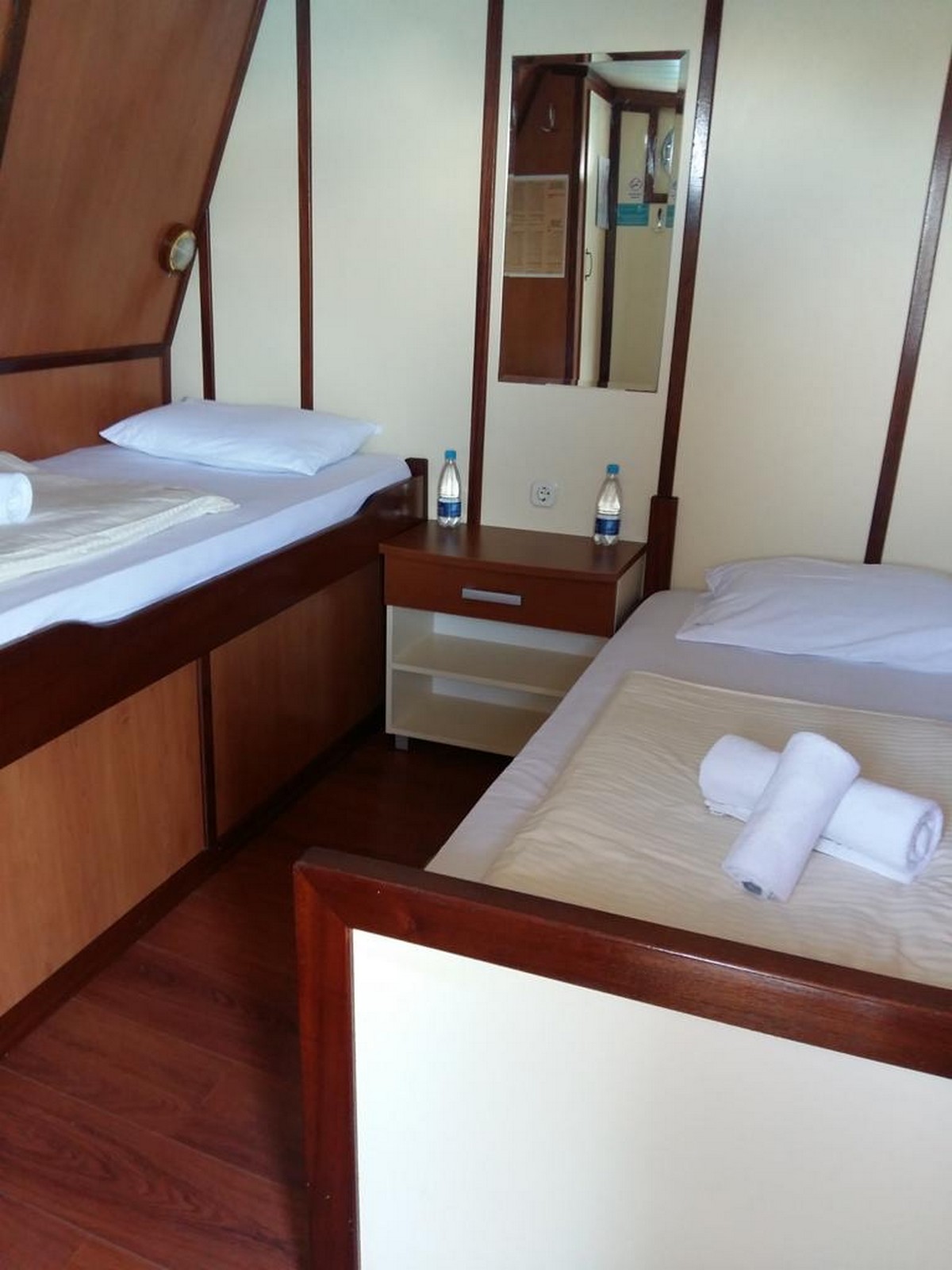 Klimatizované kajuty hotelového typu s manželskými, alebo oddelenými lôžkami sú vybavené sprchou, umývadlom a toaletou.